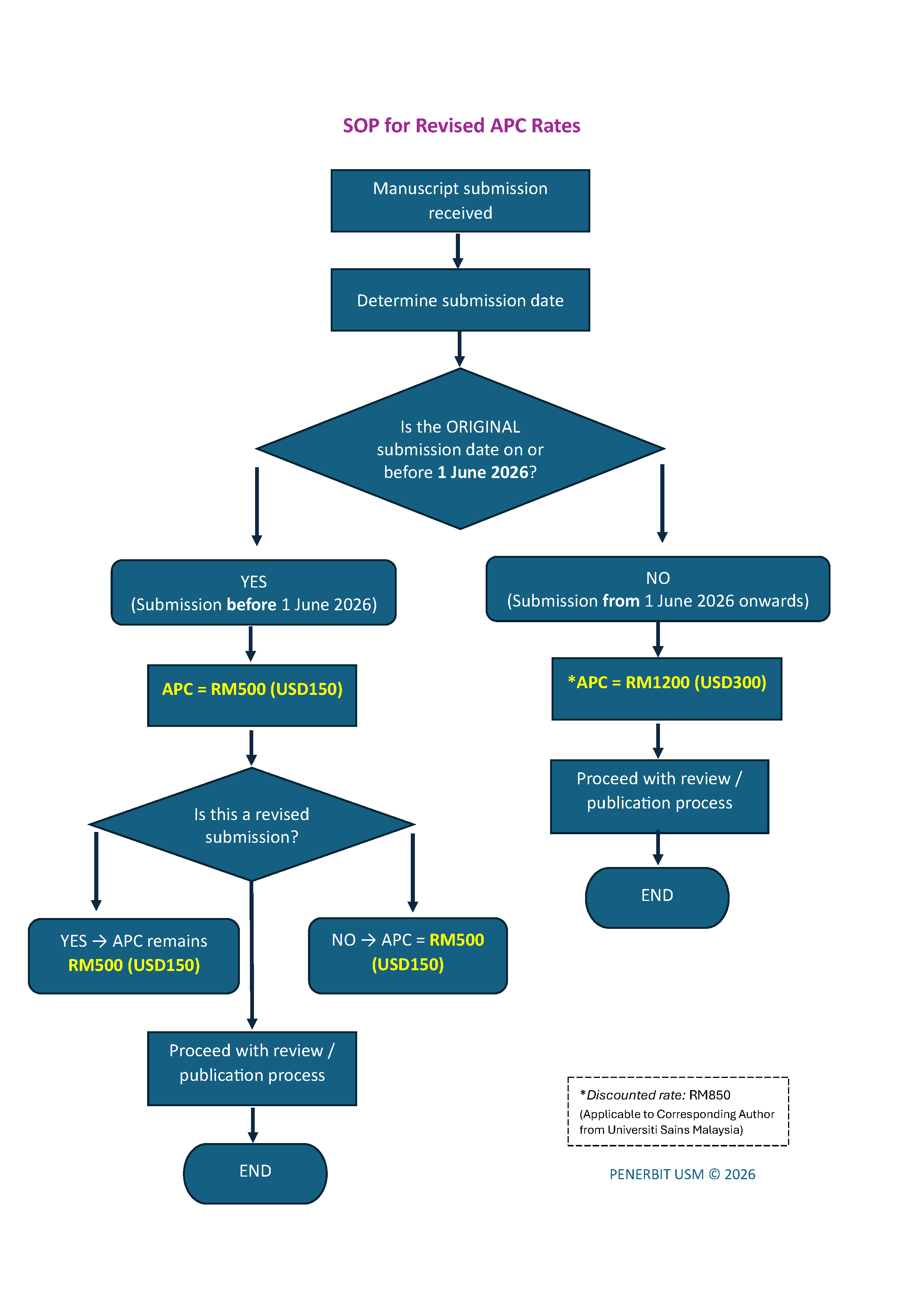 (Bank charges have to be defrayed by authors.) For manuscripts submitted prior to 1st June 2026, the previously established APC rates remain applicable, namely MYR500 for corresponding authors primarily affiliated with institutions in Malaysia and USD150 for those affiliated with institutions outside Malaysia, payable upon acceptance of the manuscript (applicable to submissions BEFORE 1st JUNE 2026). No waiver is applicable to these submissions. APC Discount Policy (Effective 1st June 2026) Corresponding authors affiliated with Universiti Sains Malaysia (USM) are eligible to publish at a discounted APC rate of MYR850. This discount applies only to manuscripts where the corresponding author’s primary affiliation is USM at the time of submission and acceptance. The discount will be applied to the APC upon acceptance of the manuscript. This policy is effective for all manuscripts submitted on or after 1st June 2026. Refund Policy Non-Refundable Situations